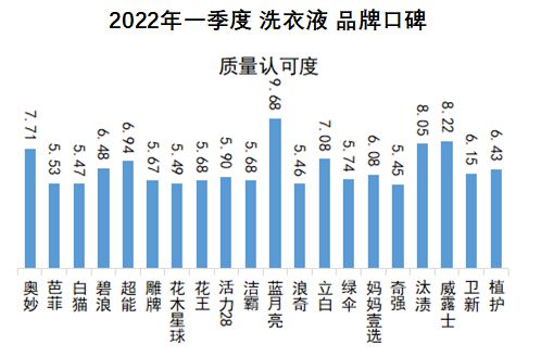 質量認可度方面,藍月亮、威露士、汰漬位居前三。奧妙、立白、超能、碧浪、植護、衛新、媽媽壹選分列第四至第十位。