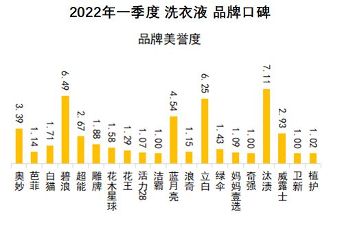 品牌美譽度方面,汰漬、碧浪、立白位居前三。藍月亮、奧妙、威露士、超能、雕牌、白貓、花木星球分列第四至第十位。