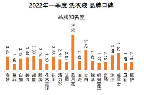 分維度來看:品牌知名度方面,藍月亮、立白、威露士位居前三。汰漬、超能、奧妙、花王、碧浪、白貓、雕牌分列第四至第十位。