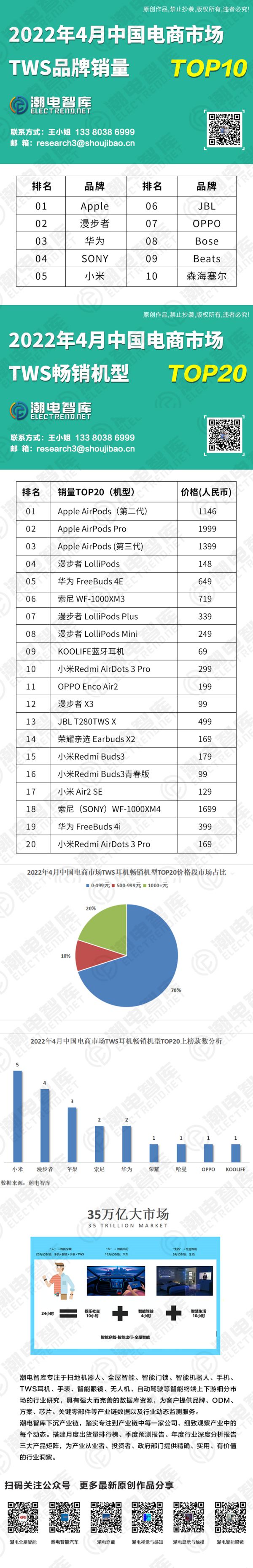 潮電智庫對(duì)2022年4月中國電商市場(chǎng)TWS暢銷機(jī)型TOP20價(jià)位進(jìn)行統(tǒng)計(jì),低于500元的低端機(jī)型占據(jù)70%的份額,中端機(jī)占10%,高端機(jī)占20%。