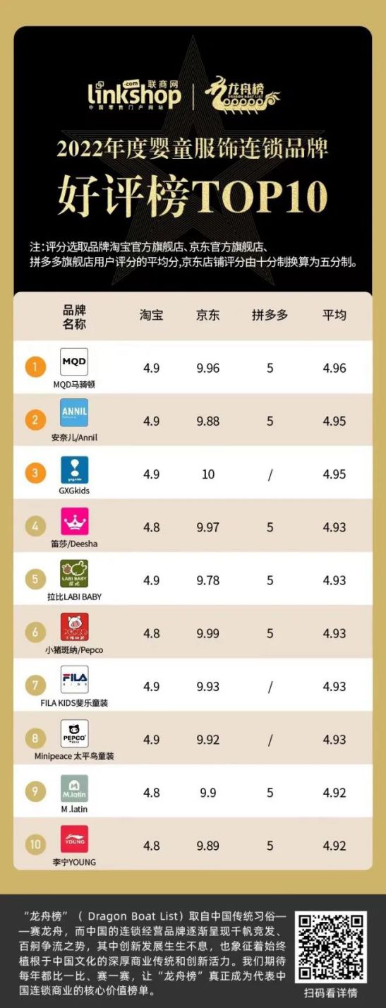 為此,《聯商網》以淘寶,京東,拼多多三個渠道為維度,比較各大品牌官方旗艦店的用戶評分情況,形成了“2022年度中國嬰童服飾好評榜TOP10”榜單。