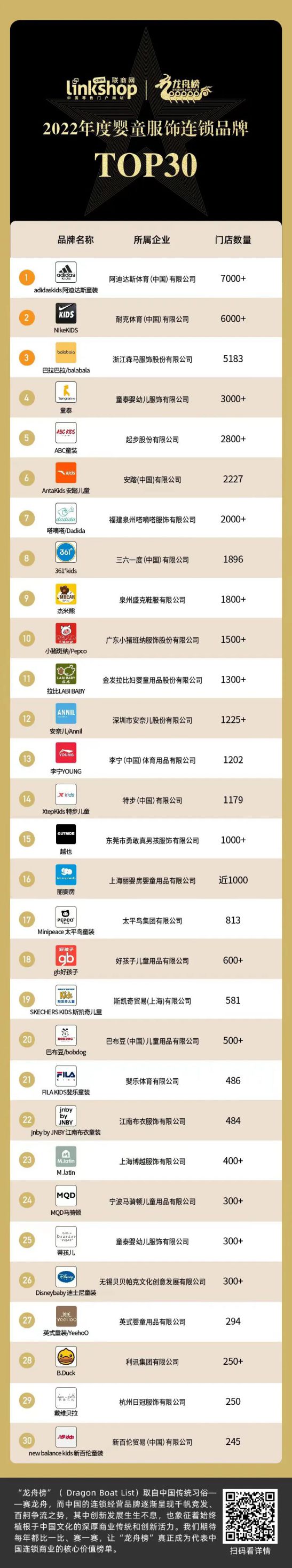 本期,《聯商網》特別推出龍舟榜之“2022年度嬰童服飾連鎖品牌TOP30”,從門店數據直觀了解嬰童服飾這一賽道上各大品牌的發展規模,同時輔以門店評分等維度,對這些品牌進行全面分析觀察,從而一探嬰童服飾在中國的發展趨勢。
