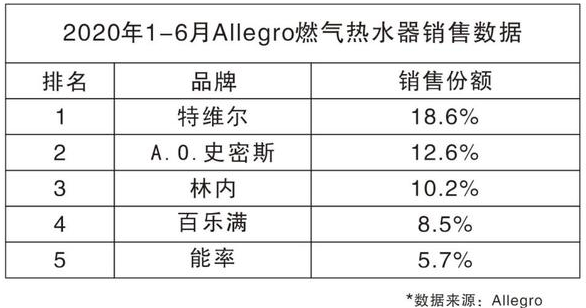據(jù)Allegro于7月13日公布的平臺(tái)燃?xì)鉄崴麂N售情況顯示,位列Allegro平臺(tái)零售TOP5的品牌分別是特維爾、A.O.史密斯、百樂滿、林內(nèi)和博世,其中,特維爾以18.6%的網(wǎng)絡(luò)零售額位列榜單首位,A.O.史密斯、百樂滿分別以12.6%和10.2%位居二三名。