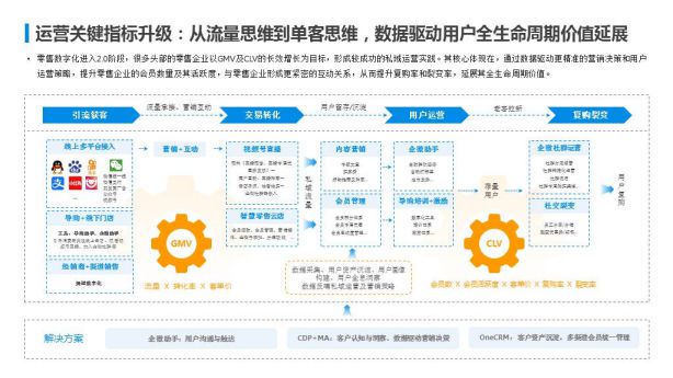 報告最后指出,受流量紅利退卻、獲客成本增加等因素影響,以規模化獲客并實現銷售轉化、從而帶動GMV增長的傳統營銷模式變得更加困難,因此零售企業的“運營關鍵指標”也在發生變化,由流量思維轉型到單客思維,數據驅動用戶全生命周期價值延展,即專注每一位既有用戶的生命周期價值(CLV)。2.0階段,零售企業更加關注會員數、會員活躍度、客單價、復購率、裂變率等核心指標。