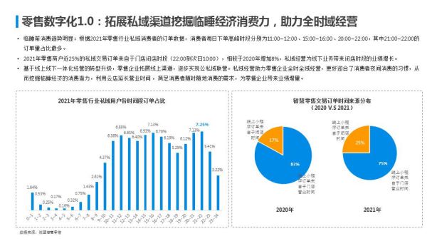 基于此,《報告》指出,通過私域渠道拓展業績增量是零售數字化1.0時代的私域的主要價值。根據《報告》數據,2021年零售行業私域用戶各時間段訂單占比數據顯示,近25%的私域交易訂單來自于門店閉店時段(22:00到次日10:00),該數相較于2020年提升8個百分點。