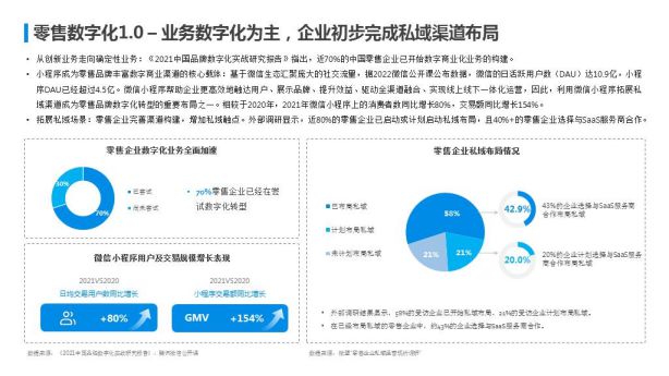與此同時,在流量紅利見頂、拉新獲客成本高企的情況下,“私域”成為品牌在布局數字商業時性價比較高的選擇。《報告》數據顯示,58%的受訪企業已開始布局私域,21%的受訪企業計劃布局私域。在已經布局私域的零售企業中,約43%的企業選擇與SaaS服務商合作。